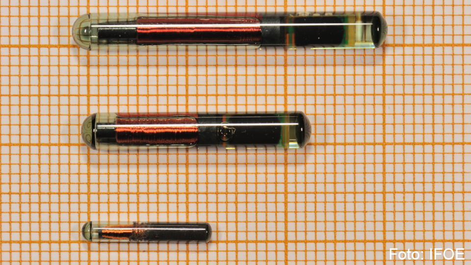Transponder werden in den Größen 8 x 1,4 mm, 12 x 2 mm, 23 x 3,9 mm und 32 x 3,9 mm eingesetzt. Grundsätzlich gilt, je größer ein Fisch ist, desto größer ist auch der verwendete Transponder.